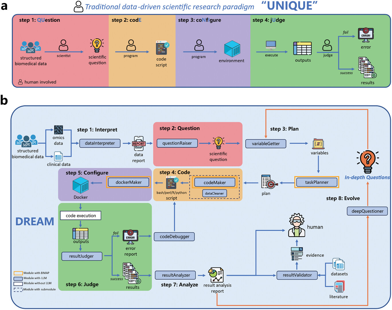 在当前海量数据与有限人力之间矛盾日益突出的背景下,DREAM是全球首个可独立完成科学探索全过程的系统,从提出科学问题、撰写分析流程、完成运算到结果验证,全程无需人工干预。系统通过模块化的智能体协作,自动完成“提问-编码-配置-评判”四大关键科研环节,彻底解放科研人员的重复劳动。
