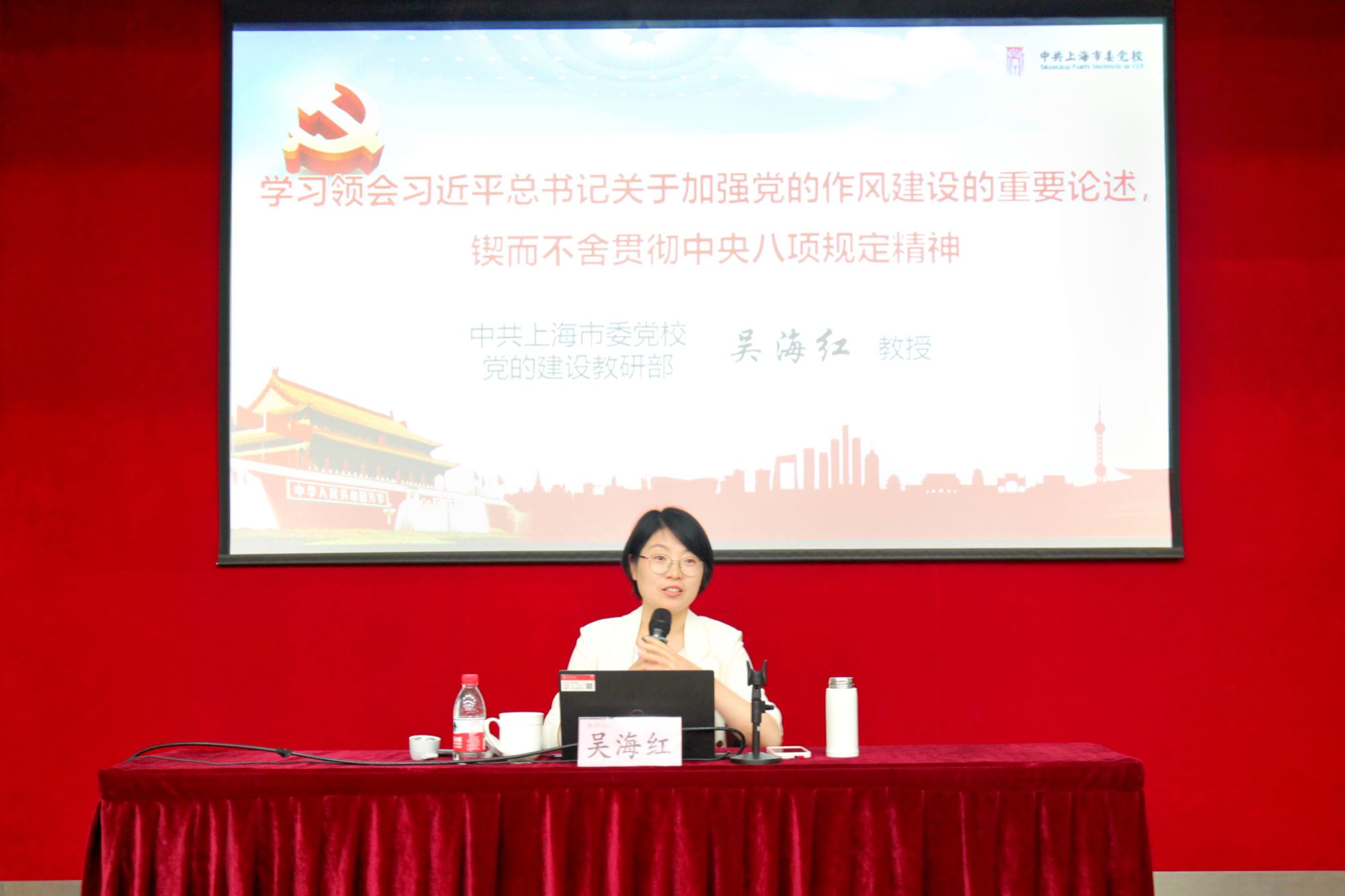 吴海红教授以“学习习近平总书记关于加强党的作风建设的重要论述,锲而不舍落实中央八项规定精神”为题,系统梳理了党的作风建设的发展历程和重要意义,从中央八项规定精神的内涵、违反中央八项规定精神的突出表现、违反中央八项规定精神的主要原因三个方面深入阐释中央八项规定及其实施细则精神的核心要义和实践要义。授课过程中,吴海红教授运用典型案例,以案说纪、以案说法、以案说责,深入浅出的剖析了集中整治的11类突出问题,对全体党员干部、师生员工深刻领会和全面把握深入贯彻中央八项规定精神学习教育,具有重要的指导意义和促进作用。