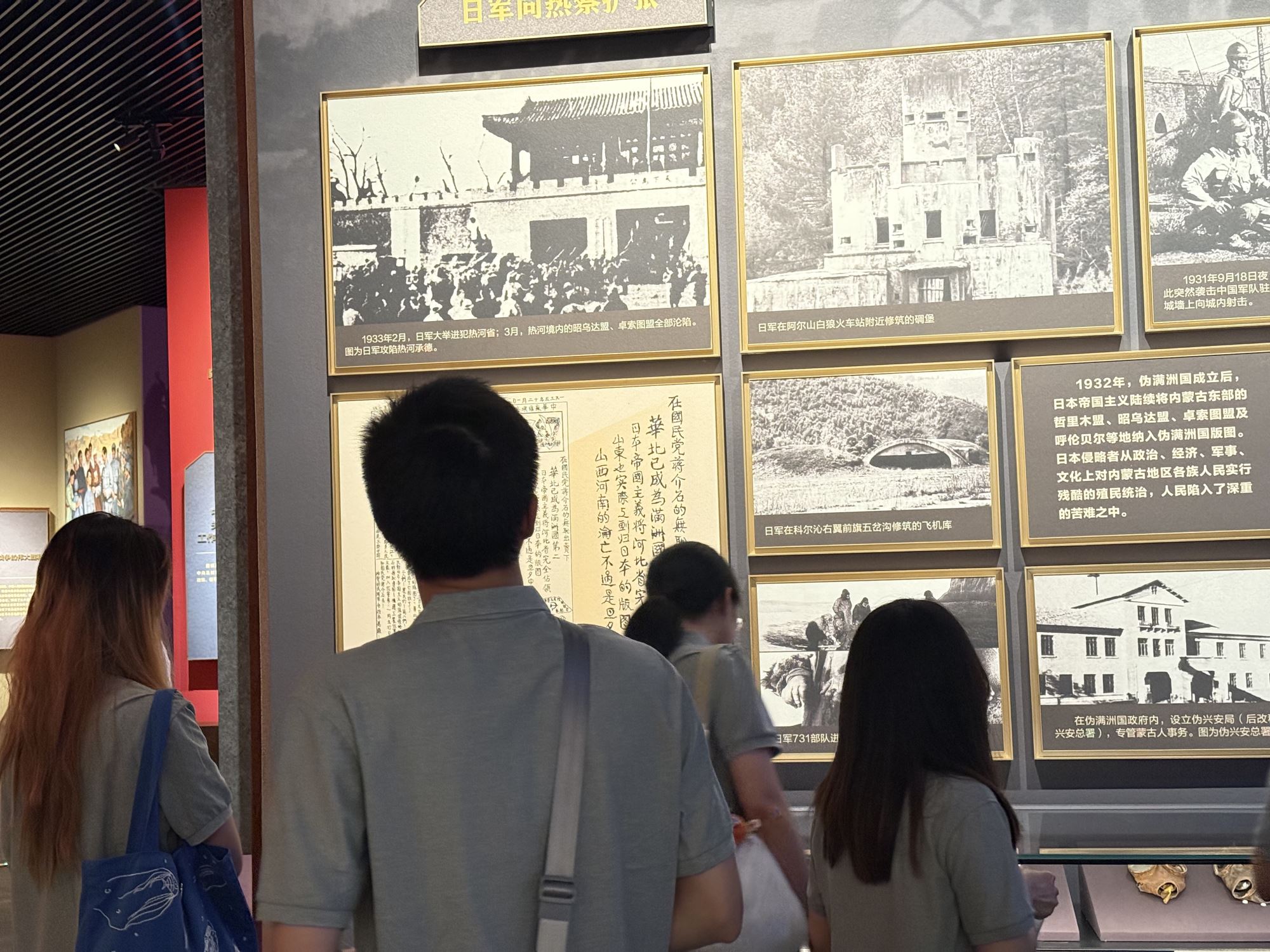 随后,实践团一行赴绥蒙抗日救国会旧址纪念馆开展了参观学习活动。成员依次参观了各个展区,通过一张张珍贵的老照片、一件件斑驳的文物,深入了解抗战时期绥蒙地区军民团结一心、共御外敌的感人故事。同学们驻足在一份份泛黄的历史照片前,仿佛穿越时空,感受到革命先辈们炽热的爱国情怀。“看到当年战士们用过的简陋装备,再想想他们创造的伟大胜利,深受感动、震撼!”支部成员在参观后感慨道。