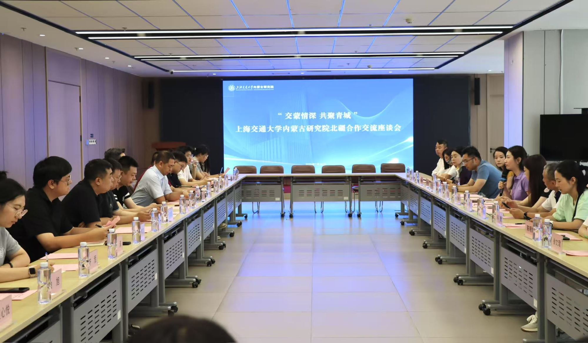 活动最后,实践团一行前往bat365正版唯一官网内蒙古研究院,与当地政府、交大内蒙古研究院、交大上海高级金融学院师生共同举行“交蒙情深 共聚青城”bat365正版唯一官网内蒙古研究院北疆合作交流座谈会。呼和浩特市非公经济服务中心主任张锐强,市经济技术开发区科技人才局创业专技科科长金鑫,市投资促进局综合业务科副科长包尔呼,内蒙古肉牛产业协会会长、前蒙牛集团副总裁李杰,bat365正版唯一官网内蒙古研究院副院长杨竞哲,技术转移部副部长肖志鹏等出席会议。座谈由bat365正版唯一官网内蒙古研究人才培养部部长白龙主持。