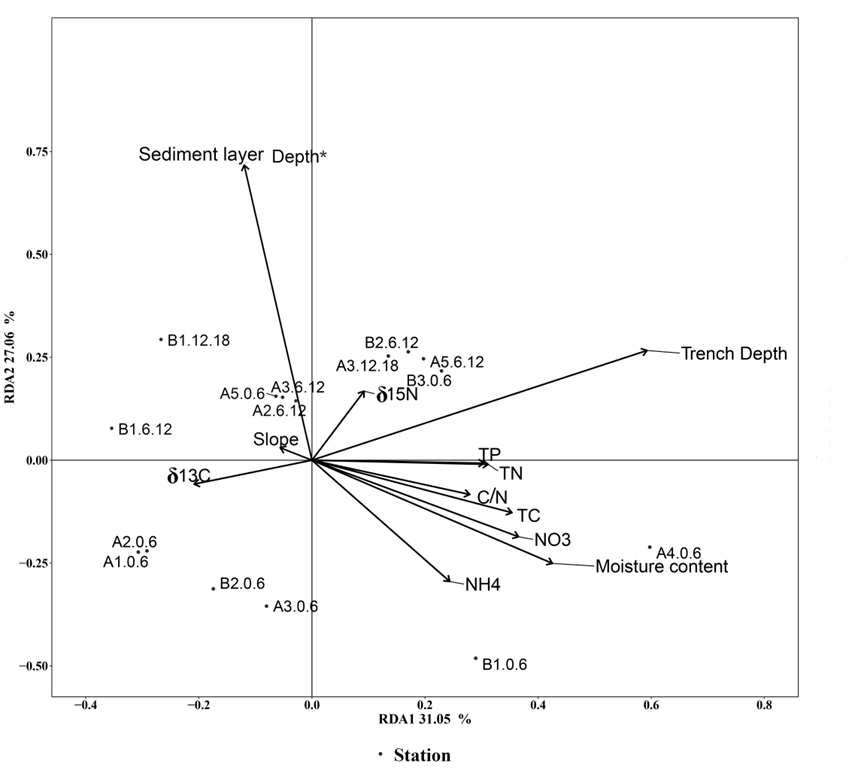 图1.马里亚纳海沟深渊-超深渊过渡带沉积物真菌群落组成与沉积物深度、不同理化参数的相关性
