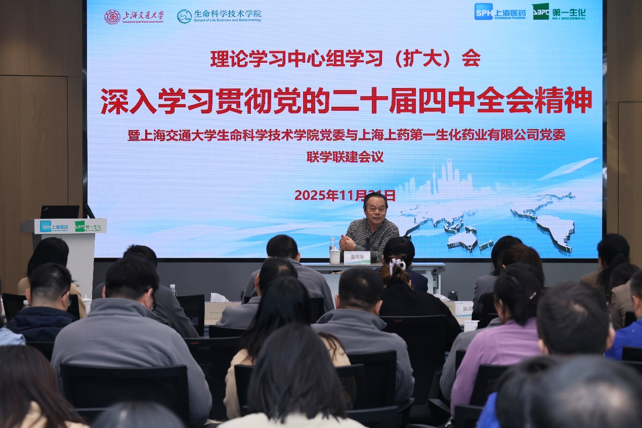 学院理论学习中心组成员与上药第一生化药业有限公司领导班子一同参加了党的二十届四中全会精神专题学习会。上海市政府参事、上海社会科学院原副院长张兆安研究员应邀作辅导报告,他从全球政治经济格局切入,深入阐释了四中全会召开的重要意义和党中央关于“十五五”发展战略规划建议的指导方针,系统解读了现代化产业体系构建、科技自立自强、新质生产力培育等关键内容,为与会人员提供了理论指引和思想启发。