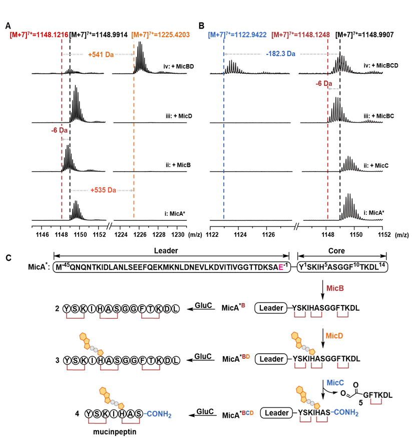研究人员通过基因组挖掘,在 Mucilaginibacter inviolabilis 中发现了一个隐蔽的RiPP生物合成基因簇 mic。该基因簇除编码前体肽 MicA 和自由基SAM酶 MicB 外,还编码一个预测的ADP-核糖基转移酶 MicD 以及一个功能未知蛋白 MicC。综合利用异源表达、体外酶学重构、高分辨质谱、核磁共振及晶体结构解析等手段,研究人员系统阐明了该新型天然产物的化学结构、关键酶功能及其完整的生物合成路径。
