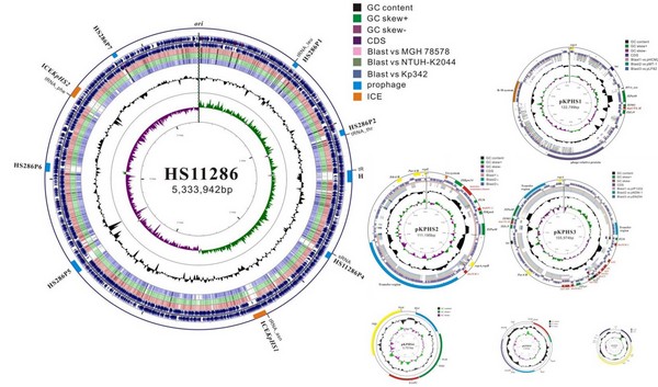 抗生素滥用引发的细菌耐药问题已成为全球关注热点之一,应对以耐碳青霉烯类抗生素为代表的多重耐药菌已刻不容缓;而肺炎克雷伯菌 (Klebsiella pneumonia) 则是院内感染最重要的多重耐药条件致病菌之一。该研究深入分析了碳青霉烯类抗生素抗性的、属于中国流行克隆群 (ST11型) 的肺炎克雷伯菌HS11286基因组,发现了6个质粒、2个整合性接合元件和7个前噬菌体等复杂的可移动遗传元件,阐明了转座子Tn3、Tn1721和Tn5393和插入序列IS26等元件对blaKPC-2等二十多个重要耐药基因的水平转移有重要贡献。此外,辅于分子遗传学实验,确定了HS11286的耐药基因缺失突变株对临床常用抗菌药物的敏感性大幅提高,由此也成功构建了可用于实验室安全遗传操作的肺炎克雷伯菌模式菌株。