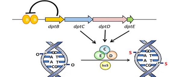 由德林教授研究小组成秋香和曹博研究发现,敲除沙门氏菌中控制磷硫酰化修饰基因dptBCDE中的dptB基因后,细胞内磷硫酰化修饰水平增强,同时在细胞快速生长时期,该基因的下游DNA磷硫酰化基因转录水平明显增高。当用dptB基因回补其突变株时,下游修饰基因的转录和细胞内磷硫酰化修饰恢复到与野生型沙门氏菌相当水平,表明dptB在转录水平上负调控DNA磷硫酰化修饰基因的表达。同时,通过精确定位DptB在DNA磷硫酰化修饰基因上游调控区的2个DNA结合区域,发现每个靶序列中都含有1对保守的正向重复序列,进一步研究也表明,这种负调控机制是DNA磷硫酰化修饰中普遍存在的调控方式。