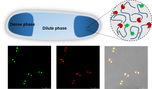 Our lab has long been focusing on the design and biosynthesis of protein polymers and biomaterials1, and my first project was actually the production of recombinant spider silk proteins in the bacterial cell factory Escherichia coli, following the endeavors of my advisors and lab seniors2,3. At first, I came up with an idea to label the spider silk protein with a green fluorescent protein, aiming to “see” the silk production levels in the bacterial cells by measuring fluorescence. Unfortunately, this did not always work reliably. The lucky thing was that my supervisor advised me to investigate the intracellular distribution of the spider silk proteins via fluorescence microscopy. Interestingly, the recombinant spider silk proteins spatially localized near the pole regions of E. coli cells (see Figure 1 below), which shocked me, simply because the silk proteins were expressed in a soluble form instead of insoluble inclusion bodies that are commonly seen in prokaryotic expression systems. Then, why and how the silk proteins condense in the living cells? It was later made clear that our spider silk proteins, natively unfolded and disordered with low-complexity sequences, share common features with the eukaryotic LLPS proteins that are naturally involved in membraneless organelle formation. Then we verified that LLPS underlay the formation of silk condensates within E. coli cells, and demonstrated functionalization of the synthetic membraneless compartments with biocatalytic activities4.Furthermore, we found that other disordered structural proteins (e.g. resilin) formed similar compartments inside the E. coli cells, indicating applicability of our compartmentalization strategy with heterologous structural proteins. In addition, the bacterial cell physiology was not substantially altered with the emergence of subcellular liquid condensates, indicating their good potential for biotechnological applications.