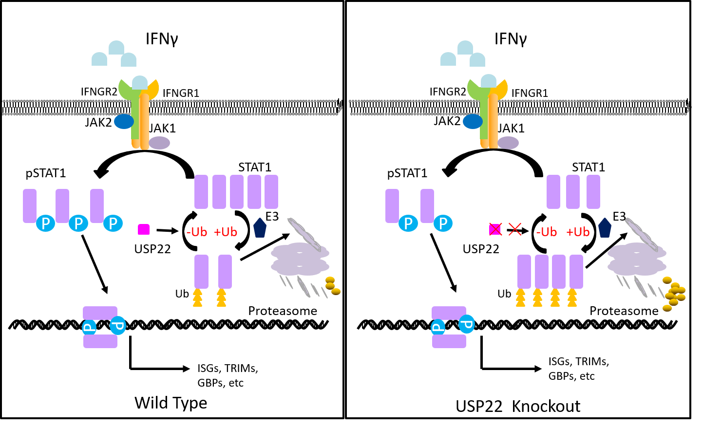The CRISPR-Cas9 mediated loss-of-function screens was used to do a whole genome knockout model in B16-OVA mouse melanomas. And we found the potential resistance genes USP22 by OT-I T cells killing screening both in vivo and in vitro. Further exploration of the mechanism found that USP22 enhanced the stability of STAT1 through deubiquitinating it, and then regulated IFNγ-JAK1-STAT1 signaling pathway. Similarly, USP22 also enhanced STAT1 stability through deubiquitinating it in human melanoma cells.