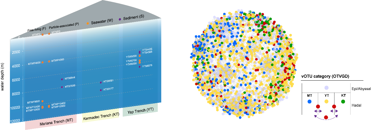 Fig 1. Left, the sampling locations and sample types of the metagenomes used for the construction of the oceanic trench viral genome dataset (OTVGD); Right, connectivity of viruses in the oceanic trenches.