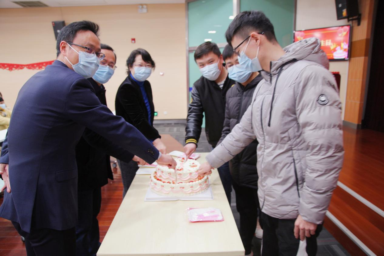 A group birthday party was held for students born January and February. The faculty and students sang the cheerful tune of Happy Birthday to You and sliced birthday cakes together.