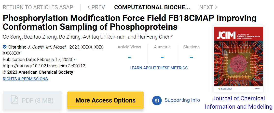 Haifeng Chen’s group from School of Life Science and Technology (SJTU) has recently published an article named “Phosphorylation Modification Force Field FB18CMAP Improving Conformation Sampling of Phosphoprotein” on J. Chem. Inf. Model. (Figure 1). The research proposed a new set of precise force field parameters for investigating phosphoproteins’ functions. Ge Song, an undergraduate from School of Life Science and Technology (SJTU), is the first author, Professor Haifeng Chen from School of Life Science and Technology (SJTU) is the corresponding author, Department of Bioinformatics and Biostatistics, School of Life Science and Technology (SJTU) is the first corresponding affiliation of the article.