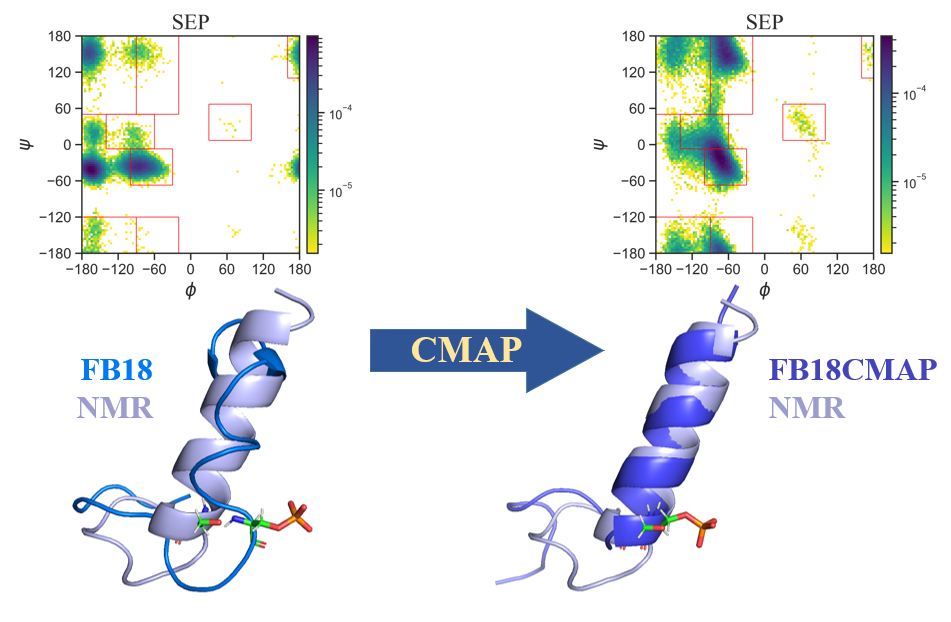 Here, a new force field parameter (named FB18CMAP) is generated by fitting against quantum mechanics (QM) energy in aqueous solution with φ/ψ dihedral potential-energy surfaces optimized using CMAP parameters. The results of MD simulation for phosphorylated dipeptides, intrinsically disordered proteins (IDPs), and ordered (folded) proteins show that FB18CMAP can better reproduce NMR observables than the FB18 force field (Figure 2). These findings suggest that FB18CMAP performs well in both the simulation of ordered and disordered states for phosphorylated proteins.