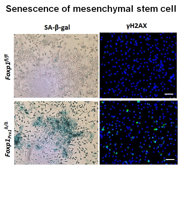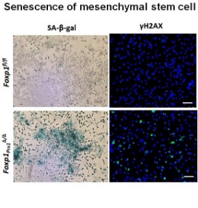 The senescence of mesenchymal stem cells underlies a variety of aging-related diseases. Recently it is a prevaling strategy to treat these diaseases with senolytic method. We have revealed Foxp1 as a transcription factor in regulating senescence of mesenchymal stem cells(MSC), which is a potential target for the treatment of aging diseases.